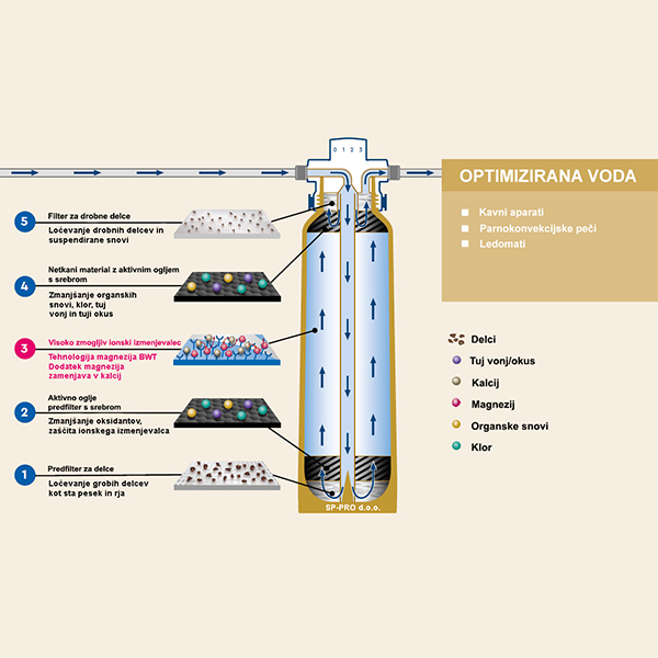 BWT bestmax PREMIUM je inovativen filtrirni sistem za optimizacijo vode, zasnovan za kavne in prodajne avtomate ter idealna izbira za parnokonvekcijske peči, kjer je kakovost vode ključnega pomena. Zanesljivo odstranjuje vodni kamen, klor, delce, neprijetne vonjave in organske spojine iz surove vode. S patentirano BWT magnezijevo tehnologijo filter vodo obogati z dragocenim magnezijem v zameno za kalcij. To ne le izboljša aromo in okus toplih napitkov, temveč tudi zagotavlja optimalne rezultate ekstrakcije kave in zaščito naprav pred vodnim kamnom. Namestitev je hitra in enostavna zahvaljujoč univerzalnemu priključku BWT besthead FLEX, kompaktna zasnova pa omogoča prihranek prostora in enostavno rokovanje.