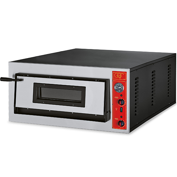 Električna peč za peko 6 pic premera do 30 cm omogoča neodvisen nadzor temperature zgoraj in spodaj preko mehanskih termostatov. Vgrajena je visokokakovostna mineralna izolacijska volna, ki zagotavlja odlično toplotno učinkovitost, kuhalna površina pa je izdelana iz ognjevzdržnega kamna. Peč je opremljena s pirometrom za natančno merjenje temperature ter notranjo halogensko osvetlitvijo za boljši nadzor med peko. Modeli E, F in FR spadajo med najkakovostnejše izdelke proizvajalca GGF in so zasnovani z vrhunskimi komponentami. Modela F in FR sta na voljo tudi z digitalnim termostatom za še natančnejšo regulacijo toplote.
