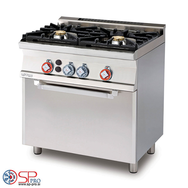 gorilniki in statično plinsko pečico. Gorilniki s pilotnim vžigom in varnostni ventili s termoelementi. Gorilniki z moduliranim plamenom, žari v ulitku železo, odstranljivi zbiralniki tekočine. Prostorna pečica s širokimi vrati, piezoelektrični vžig, opremljen s plinskim žarom in časovnikom. Dimnik na zadnji strani, skupaj z varnostnimi napravami. Vsi deli so dostopni z enostavno odstranitvijo sprednje nadzorne plošče. Naprava se napaja z LPG in zemeljskim plinom.