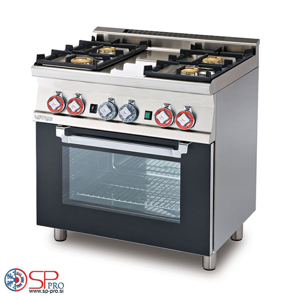 gorilniki in statično plinsko pečico. Gorilniki s pilotnim vžigom in varnostni ventili s termoelementi. Gorilniki z moduliranim plamenom, žari v ulitku železo, odstranljivi zbiralniki tekočine. Prostorna pečica s širokimi vrati, piezoelektrični vžig, opremljen s plinskim žarom in časovnikom. Dimnik na zadnji strani, skupaj z varnostnimi napravami. Vsi deli so dostopni z enostavno odstranitvijo sprednje nadzorne plošče. Naprava se napaja z LPG in zemeljskim plinom.