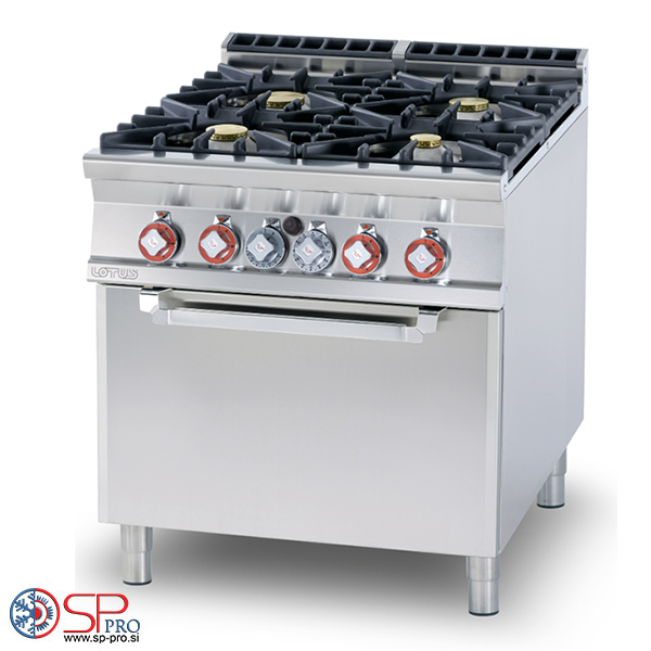 gorilniki in statično plinsko pečico. Gorilniki s pilotnim vžigom in varnostni ventili s termoelementi. Gorilniki z moduliranim plamenom, žari v ulitku železo. Prostorna pečica s širokimi vrati, piezoelektrični vžig, opremljen s plinskim žarom in časovnikom. Dimnik na zadnji strani, skupaj z varnostnimi napravami. Vsi deli so dostopni z enostavno odstranitvijo sprednje nadzorne plošče. Naprava se napaja z LPG in zemeljskim plinom.