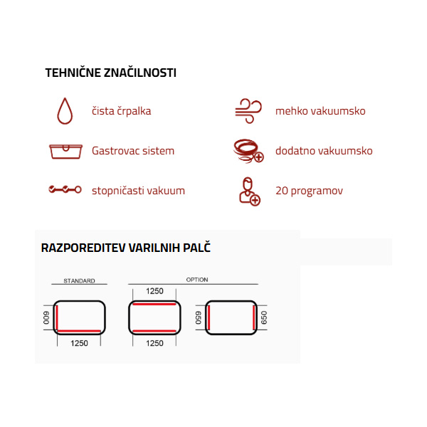 Naprava za vakumiranje je odlična za pakiranje in shranjevanje vseh živil, saj podaljša njihovo svežino in obstojnost ter preprečuje razvoj bakterij. Primerna je za vakumiranje različnih vrst živil – mesa, rib, mlečnih izdelkov, zelenjave, tekoče hrane itd. Kvalitetna naprava je v celoti izdelana iz nerjavečega jekla, kar zagotavlja trpežnost in dolgo življenjsko dobo. Namenjena je profesionalni uporabi v restavracijah, mesnicah, živilskih obratih, trgovinah in drugih prehrambnih dejavnostih. Opremljena je z LCD zaslonom, ki omogoča enostavno upravljanje in čiščenje ter zagotavlja intuitivno uporabniško izkušnjo. Delovanje naprave je avtomatsko in hitro, omogoča pa 98 % vakum, kar pripomore k optimalnemu shranjevanju živil. Vgrajena vakumska črpalka priznanega podjetja Busch/Euromatic zagotavlja zanesljivo in učinkovito delovanje. Naprava je opremljena z dvema varilnima letevma – ena dolžine 1250 mm in druga 600 mm, kar omogoča učinkovito in prilagodljivo vakumiranje večjih količin živil hkrati. Žarilna nitka je lahko različnih dolžin, dvojna ali enojna, kar dodatno povečuje njeno funkcionalnost.