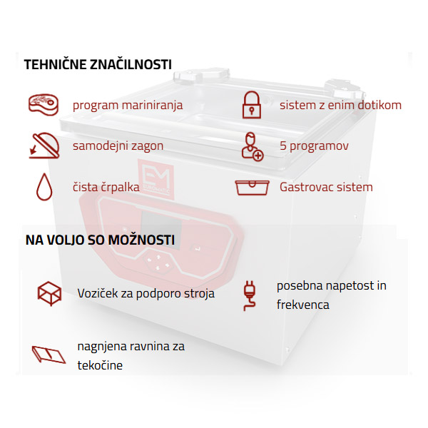 E-VAC 25 je vrhunska naprava za vakuumiranje, zasnovana posebej za restavracije, mesnice, trgovine in živilske obrate, kjer je svežina živil ključnega pomena. E-VAC 25 združuje visoko zmogljivost in enostavno uporabo v kompaktni napravi, ki je popolna za profesionalno gostinsko okolje in zahtevne uporabnike. Izdelana iz visokokakovostnega nerjavečega jekla z robustnim ravnim pleksi pokrovom zagotavlja dolgotrajno uporabo in brezhibno higieno. Opremljen je s 3,5″ barvnim zaslonom, popolnoma avtomatskim delovanjem in možnostjo shranjevanja do 5 programov. E-VAC 25 vključuje samočistilni črpalni sistem, ki vzdržuje čistočo olja v črpalki ter zagotavlja optimalno delovanje. Za maksimalno udobje vključuje sistem One Touch, program za mariniranje, samodejno odpiranje pokrova po vakuumiranju ter praktičen zaklep z vzmetjo. Z E-VAC 25 boste dosegli zanesljivo zaščito živil, daljšo obstojnost in vedno optimalne rezultate, hkrati pa prihranili čas in energijo.